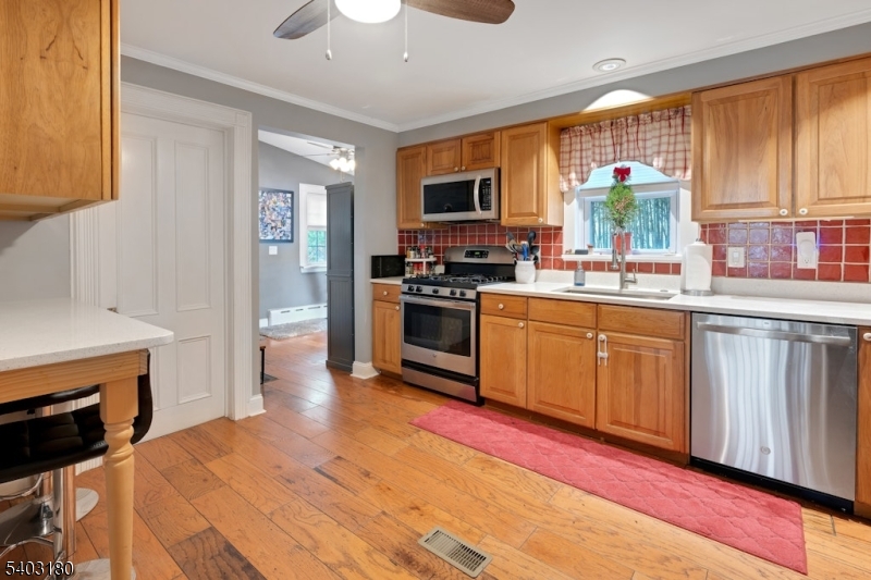 This immaculate 4 bedroom colonial has all the charm of a traditional farmhouse combined with modern updates. The formal living room and dining room feature hardwood floors with inlay. The Living Room is separated from the formal dining room by pocket doors. The dining room offers a built in cabinet and charming window seat. The sunken family room has a wood burning stove and built-ins as its focal point. The kitchen has a separate breakfast nook and granite counters. The master bedroom features a full bath, walk in closets and a separate sitting area. Additional features include high ceilings, custom trim, updated multi zone heat and central A/C. The detached barn has spaces for 3 cars as well as a workshop and/or storage. All this and more is situated on almost a half acre of park like property that is completely fenced in. It is close to major highways, shopping and public transportation. Nothing to do but move in!