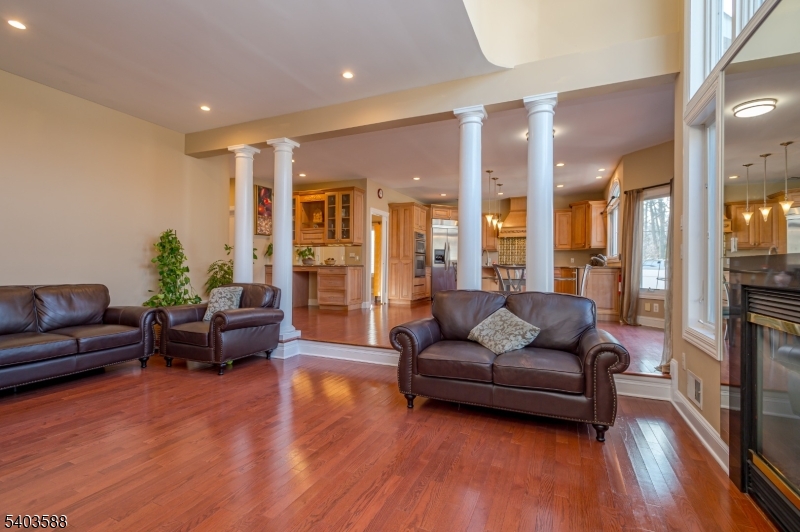 East-facing colonial home featuring a classic brick front, paver driveway, and inviting walkway leading to a bright, open foyer with a stunning chandelier and abundant natural light. The main level offers 10-ft ceilings, a spacious LR and DR combo with HW flooring, accented by elegant columns that define each space with timeless appeal and enhanced by a built-in surround sound system. The gourmet kitchen features SS appliances, a center island with seating, a mini bar/butler pantry. Custom windows on the first floor enhance natural light throughout. Sliding doors open to a fully fenced backyard with a paver patio and lawn, perfect for outdoor enjoyment. The family room offers HW flr, classic columns, a step-down design adding architectural character, and a conveniently located powder room. The first floor hallway connects to the laundry and pantry area and provides direct access to a two-car garage. The second level overlooks the foyer and offers a spacious primary bedroom with 8+ foot ceilings and a luxurious en-suite bath featuring a stall shower, jacuzzi tub, and two closets. Three bedrooms feature large windows and ample closet space. A full hall bathroom includes a tub and a double vanity. The unfinished basement has nine-foot ceilings, offering excellent potential for future customization. The whole house has central vacuum. Ideally located near the GSP, NJT, 287 & 1, shopping, dining, and Metropark Train Station.